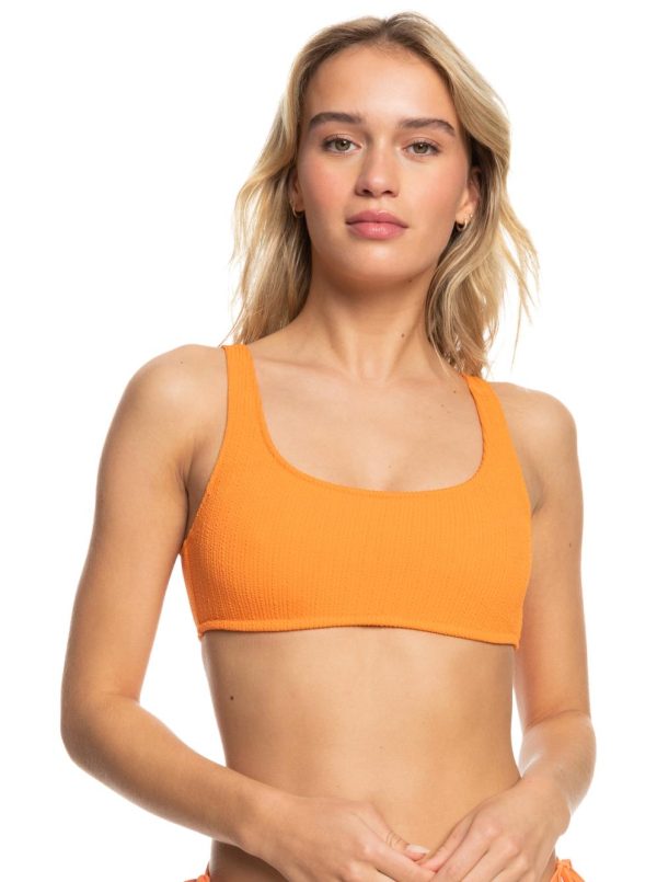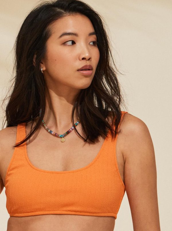 Made of eco-conscious textured swim fabric, this solid bralette bikini top has a pullover shape with fixed over-the-shoulder straps and removable cups. Sporty and swim-ready, she comes in a range of on-trend colors to boost your bikini collection.