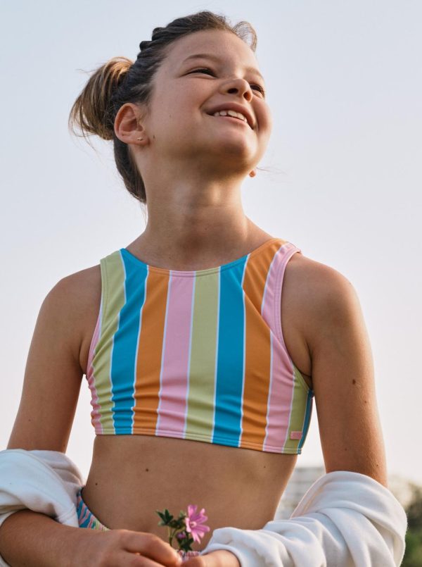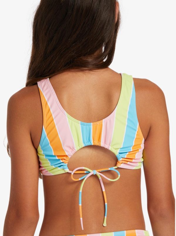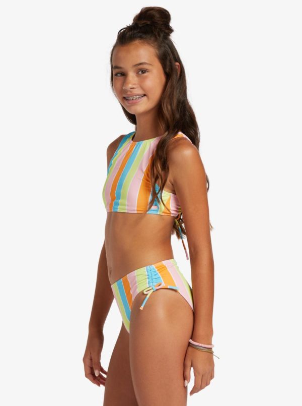 Made of recycled and chlorine-resistant swim fabric, the Last Paradise printed bikini set for girls includes a pullover crop top with a knotted back drawstring and full-coverage bottoms with side ties. Comes in a range of playful prints only ROXY does best.